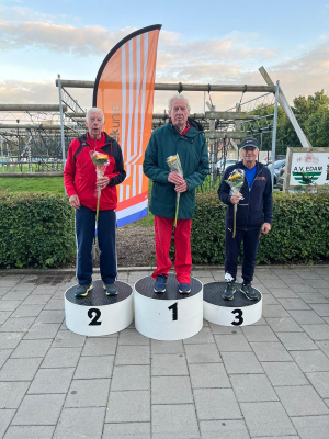 Vorig jaar maart heeft Harrie een nieuwe knie “gekregen” en had sindsdien nog geen wedstijden gedaan. Zijn doel was om vooral veel plezier te hebben en de werp-5-kamp heel door te komen. En dat deed hij! Tot het laatste onderdeel stond hij 3e, maar na een flinke krachtsinspanning op het gewichtwerpen wist hij nipt 2e te worden bij de mannen 80+!
