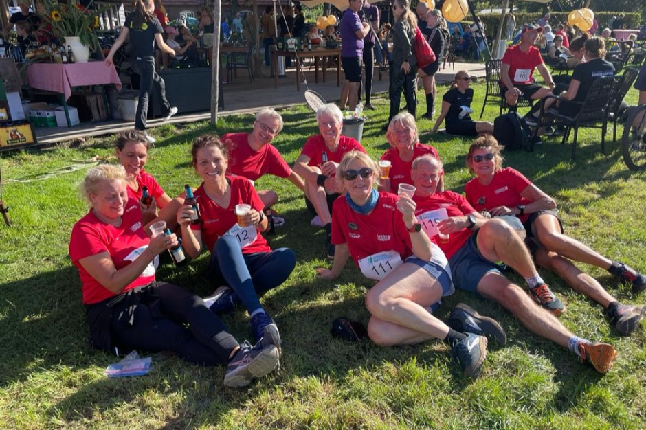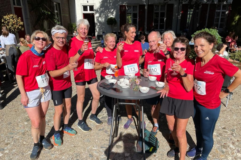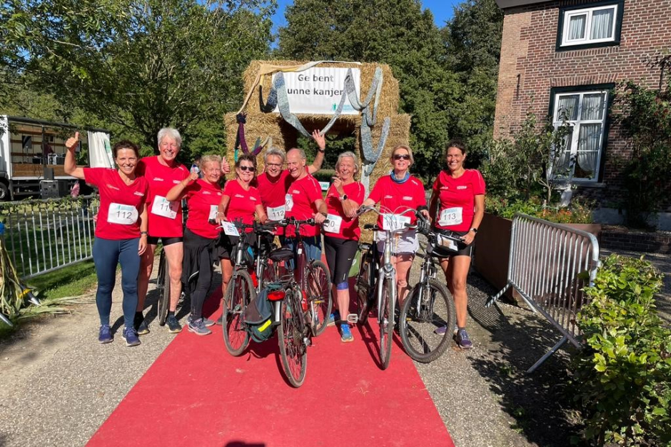 Moe, maar voldaan (en volgegeten) kwamen de negen rode lopers/fietsers na vijfeneenhalf uur, als een team over de streep. En daar ontvingen we allemaal de beloning: een speciale button, met de tekst: “Ge bent unne kanjer”. En dat voelden we ook zo.