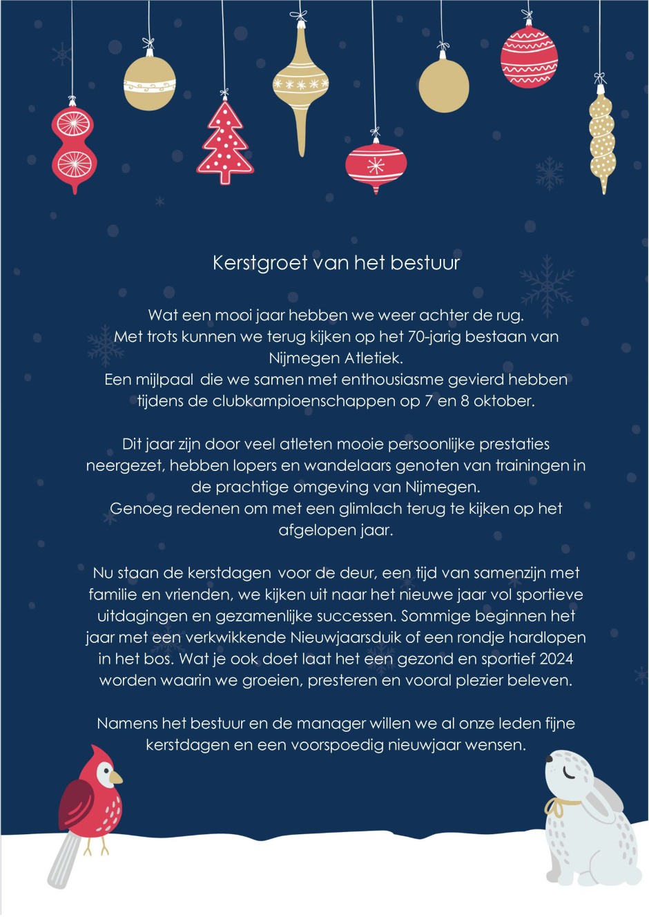 Nu staan de kerstdagen voor de deur, een tijd van samenzijn met familie en vrienden, we kijken uit naar het nieuwe jaar vol sportieve uitdagingen en gezamenlijke successen. Sommige beginnen het jaar met een verkwikkende Nieuwjaarsduik of een rondje hardlopen in het bos. Wat je ook doet laat het een gezond en sportief 2024 worden waarin we groeien, presteren en vooral plezier beleven.
